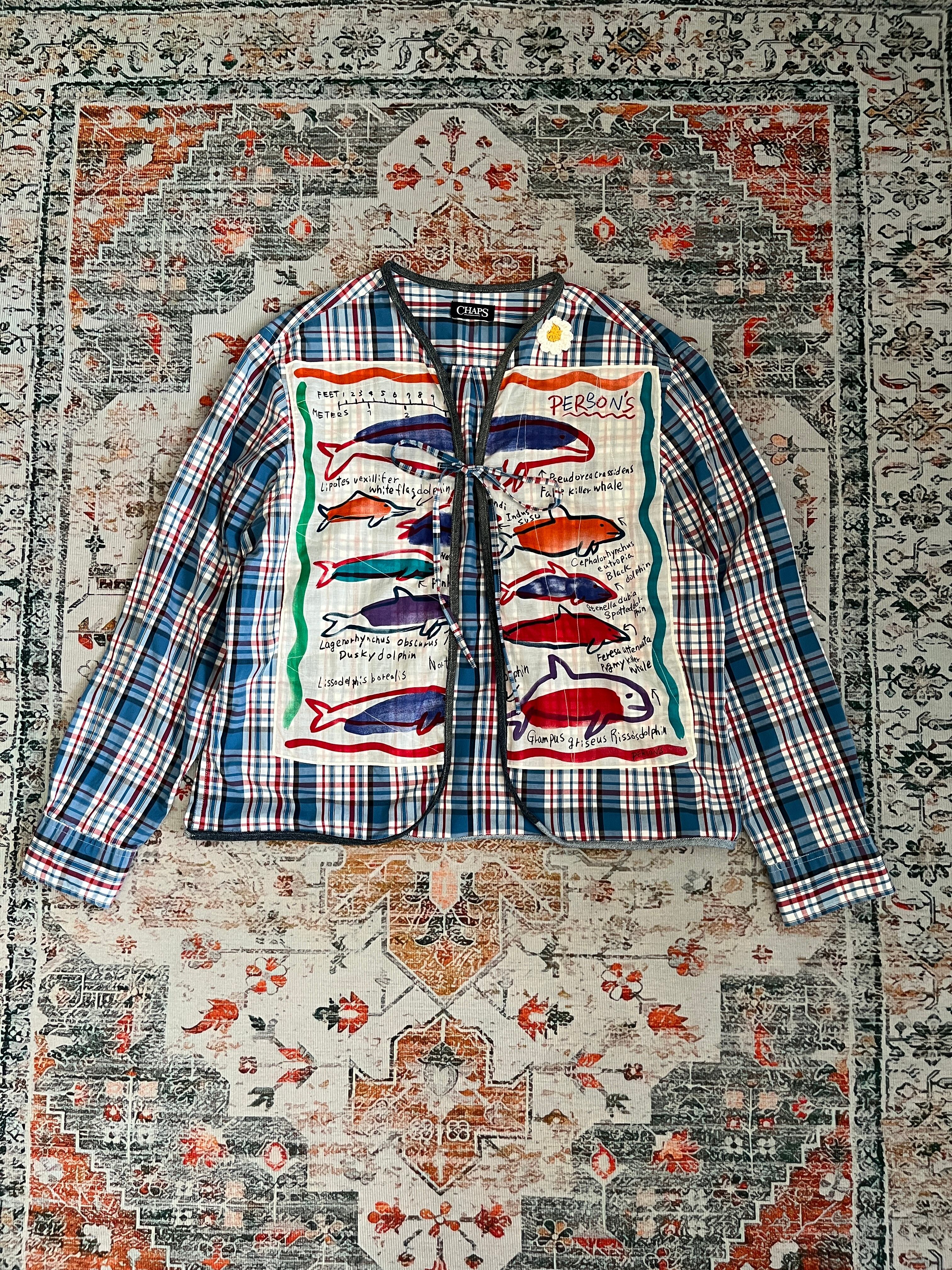 Hand-Carved Print & Handkerchief Patchwork Remake Shirt – “Sea Memory”