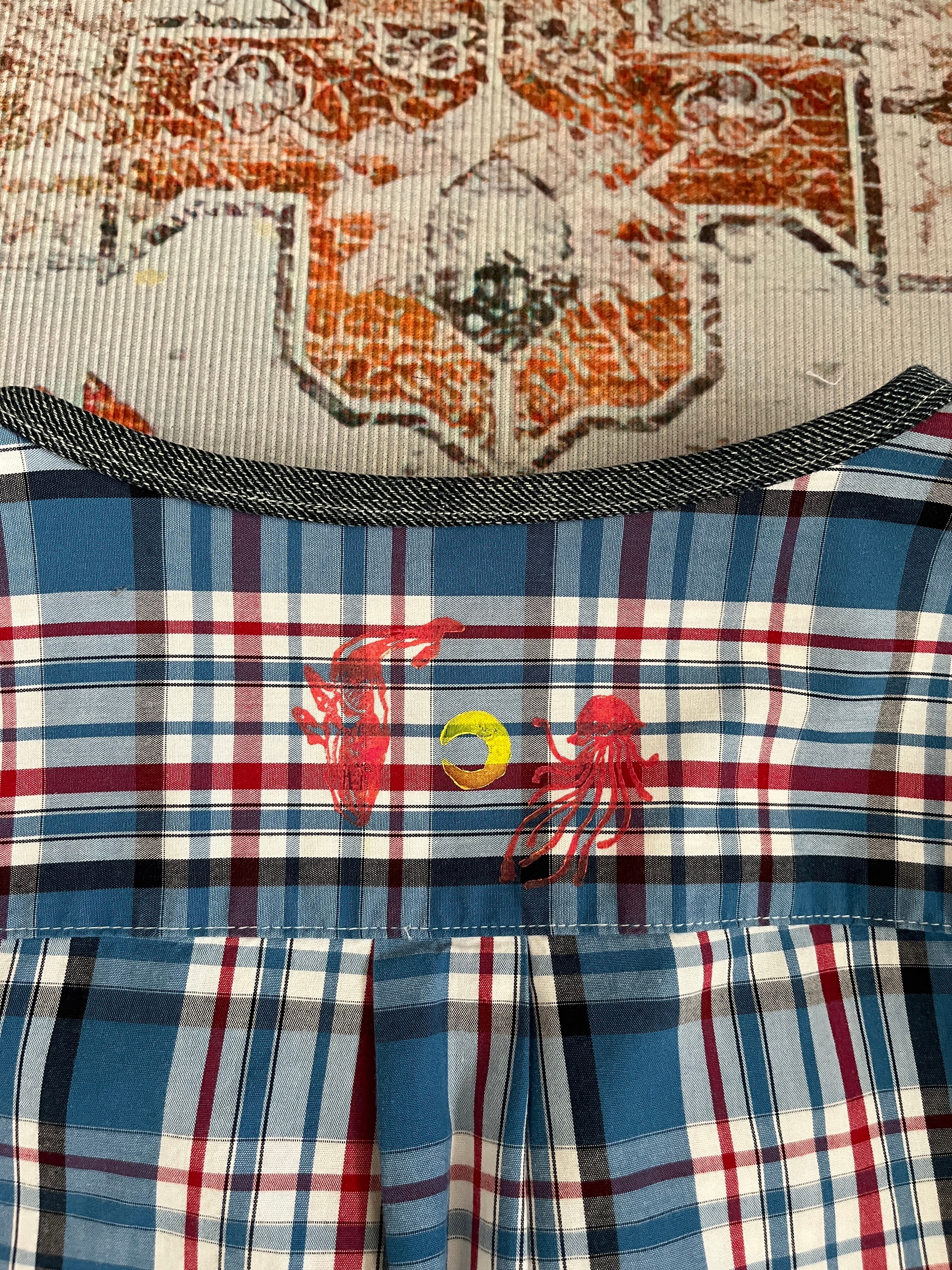 (手彫り版画とハンカチパッチワークのリメイクシャツ ― 海の記憶)