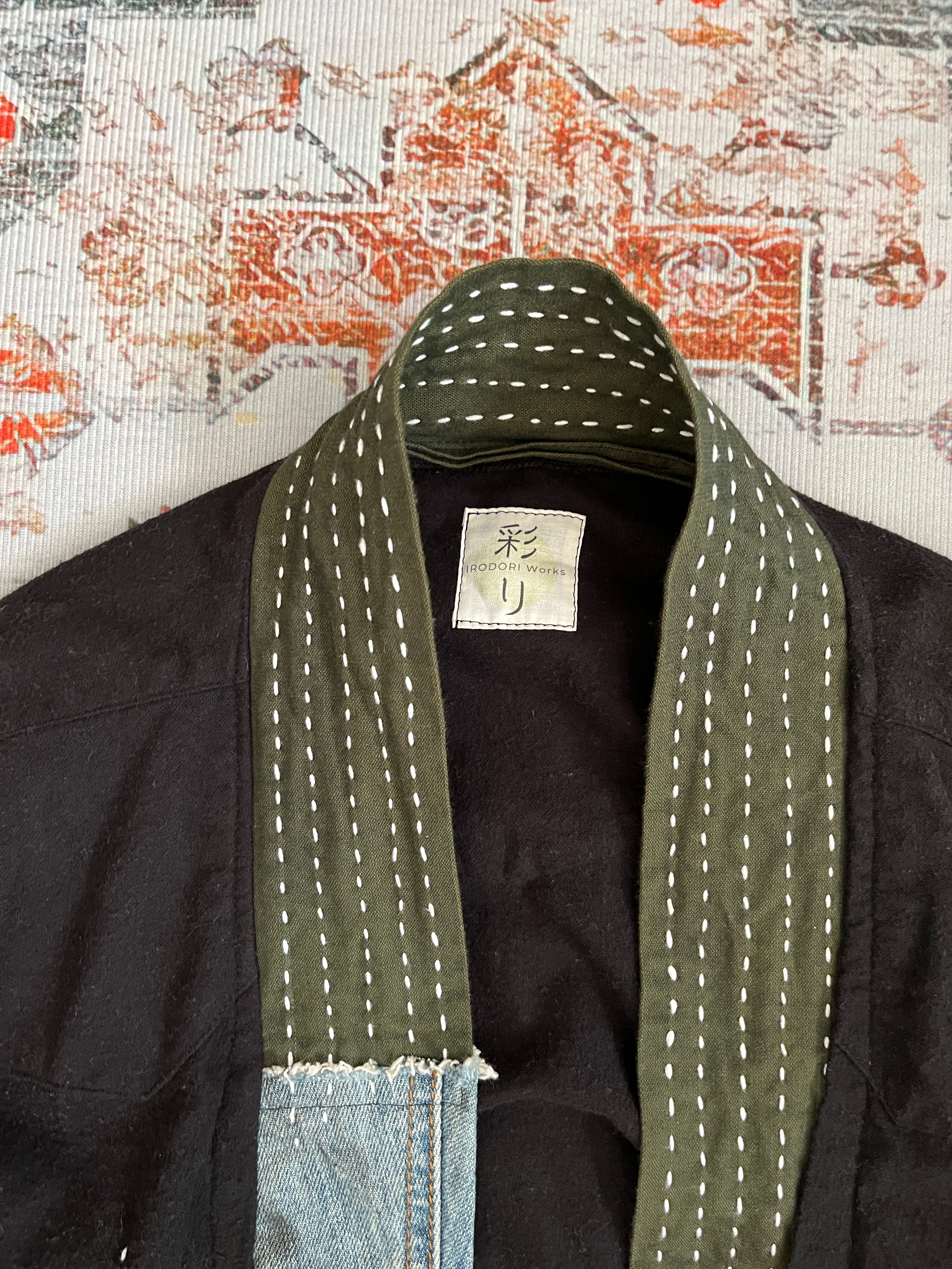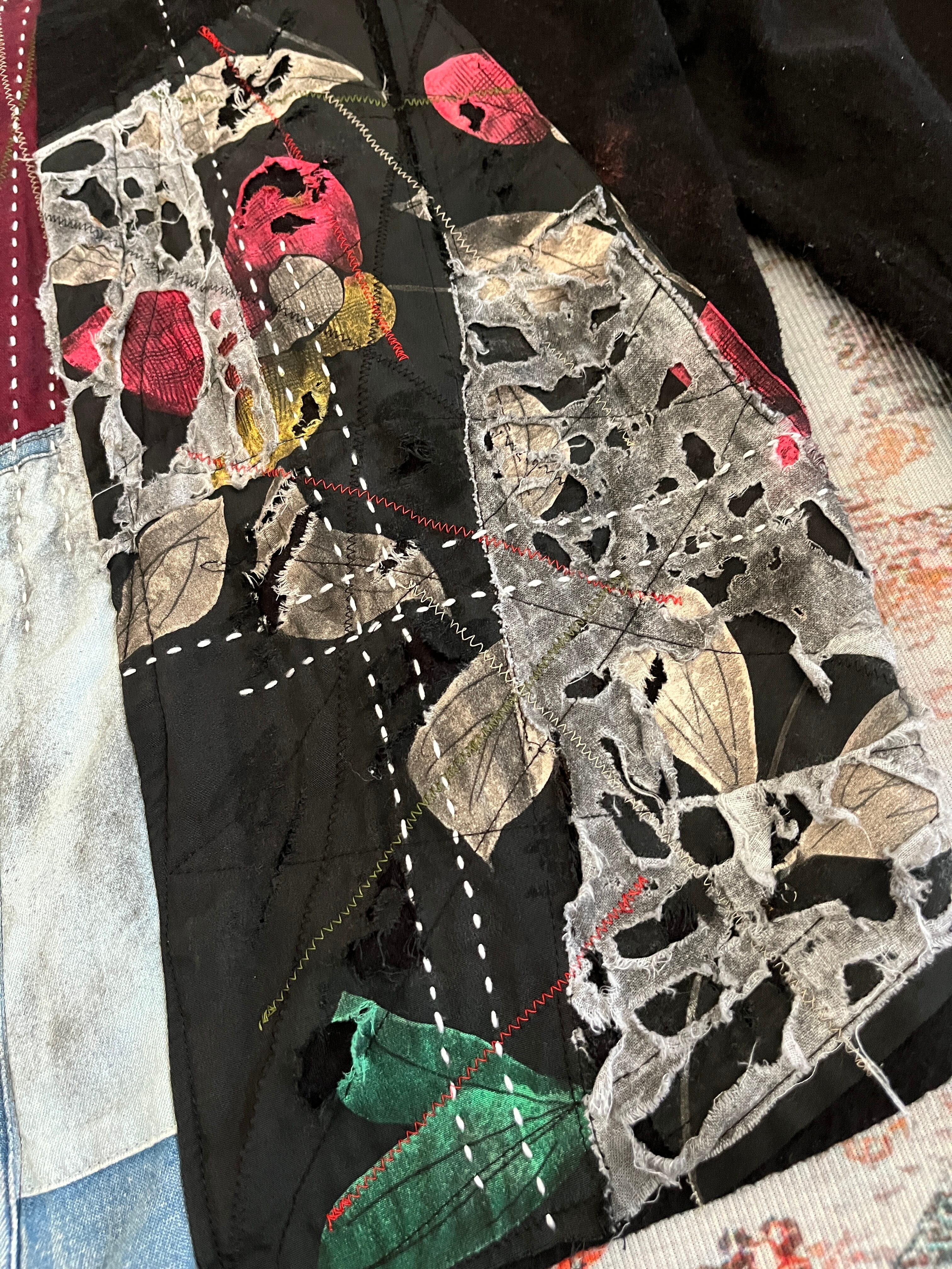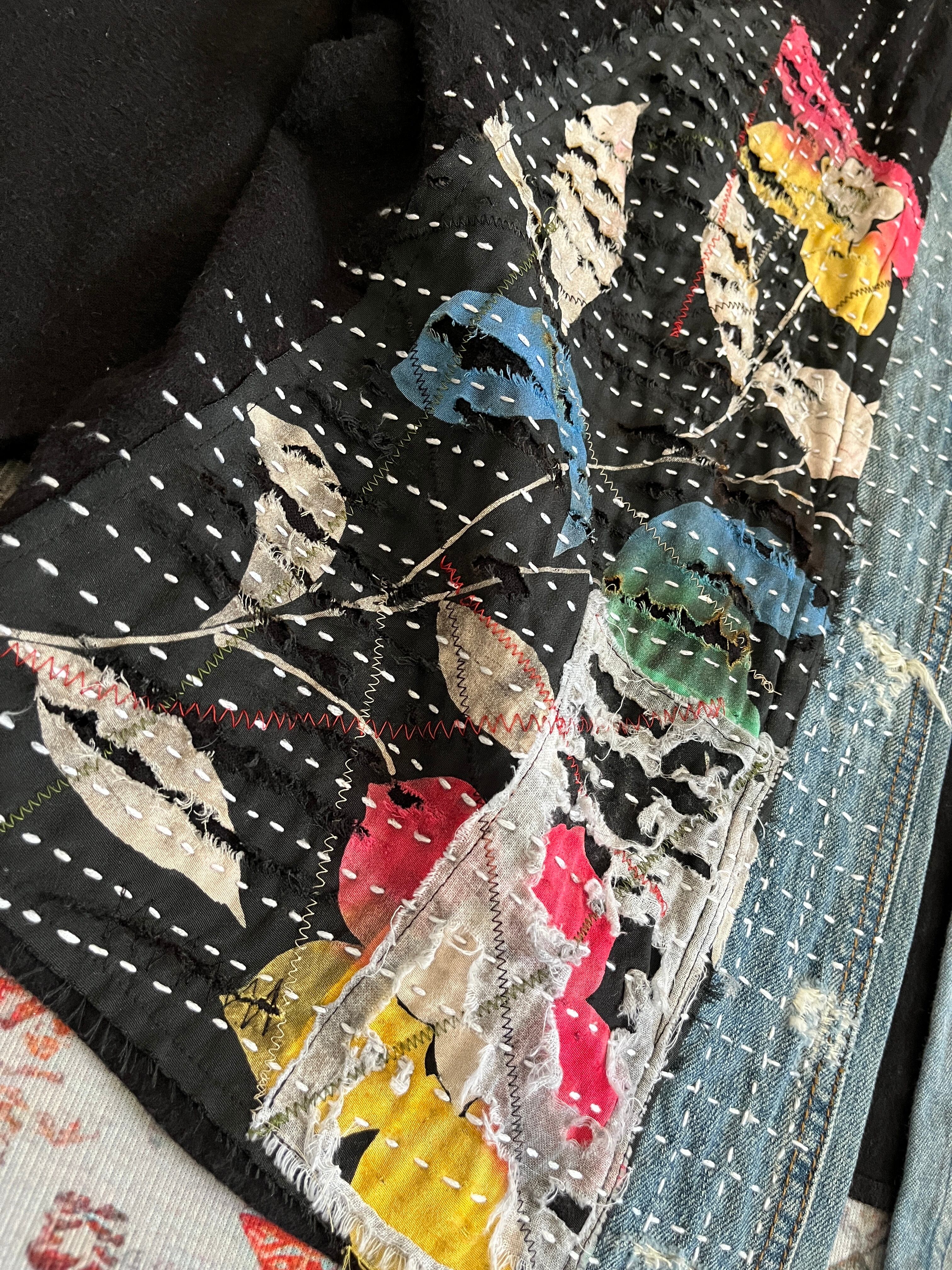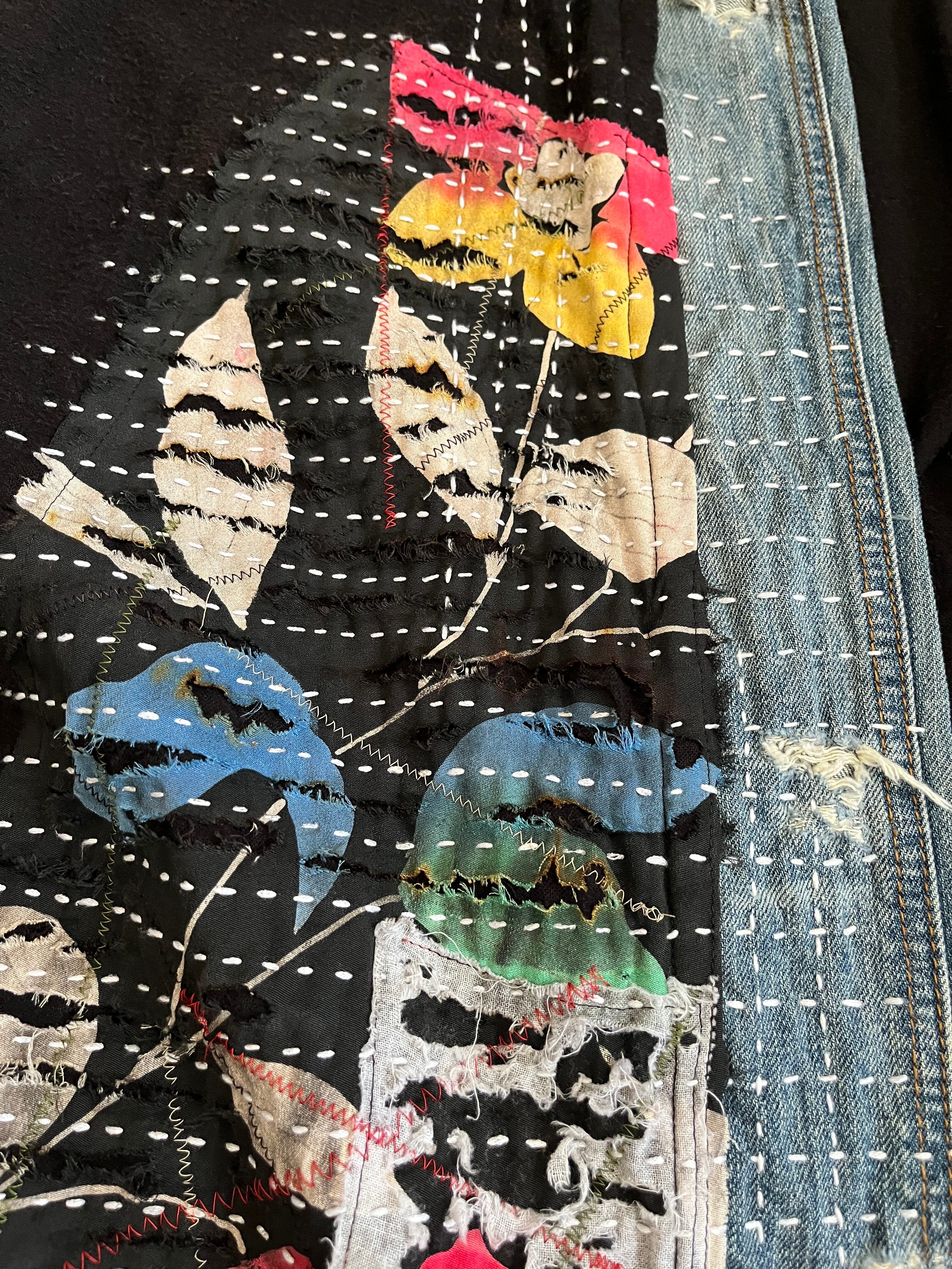 ブラックのコットン生地をベースに、様々な素材を大胆にパッチワークし、手縫いの刺し子ステッチを施しています。