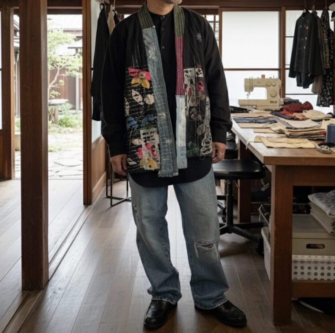 古布の風合いと現代的デザインが融合した、襤褸(BORO)×刺し子(SASHIKO)リメイクカーディガンジャケットです。